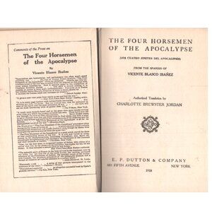 Step into the echoes of history with this antique edition of The Four Horsemen of the Apocalypse by Vicente Blasco Ibáñez. Translated by Charlotte Brewster Jordan—the first authorized English edition—this WWI-era novel explores the haunting toll of war through the eyes of a divided European family.