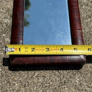 This mirror does show some wear around the top of the frame. On the back it is taped up. It was found in this condition. It does have a small loop to hang on the wall.