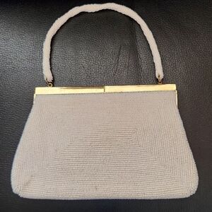 Absolutely stunning and mint condition beaded handbag from Japan. Creamy white beads and sequins cover the front in a criss cross pattern. Back is covered in beads in an envelope pattern. Gold tone metal frame with mother of pearl accent. Kiss closure feature. Matching beaded handle with a 4.5 inch drop. Interior is lined in a cream colored satin. One small side patch pocket. Made in Japan label. Dimensions: 7.5 inches long x 5.5 inches tall. Roomy enough to carry all essentials!