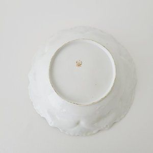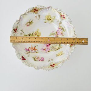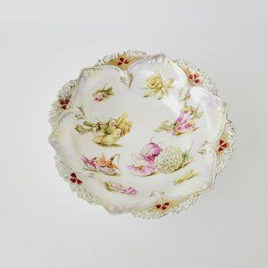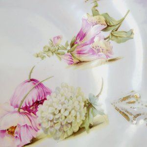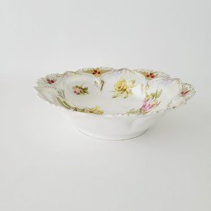 This RS Prussia antique floral porcelain bowl, in white and pink, features a hand painted floral design with gold accents. Its satin finish and Art Nouveau style make it a standout piece for any home decor.