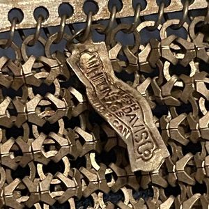 From my personal collection, Art Deco Whiting & Davis Enamel Metal Mesh Purse Gold (but could be bronze) & blue Enamel design on white background, signed tag is on inside . In very Good to excellent condition, est 1930s.