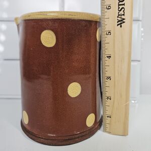 Rare antique red slip ware pitcher by Eric Anderson, a known Wisconsin folk potter. Features rustic red clay with signature yellow dot motif. Marked and signed on the bottom: *"From my hands to yours" enjoy.* Perfect as a decor accent or collector's piece. Handmade, likely 1960s1970s. Style: *Rustic & Primitive*.
