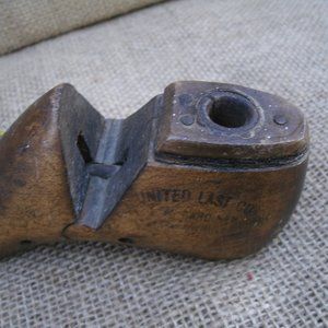 Antique wooden shoe form from 1930s. Hand painted design on front. Not sure when the design was painted on it, but it is old, too. Heel has a metal piece and there's a piece on top where it screwed onto a stand. Says "United Last Co." on one side, "Texan" on the other. Painting is ribbons and toys with a poem: "Dust be still, Cobwebs go to sleep, I'm rocking my baby, and babies don't keep!" 6 1/2 inches long, 2 3/4 inches high, 2 3/8 inches wide. Measurements indicate it was for making kid's shoes. Good condition for age and use. It was obviously used to make shoes for a long time. It has wear, patina on metal heal, tack marks on bottom. Couple cracks on back from use. See photos. Painting excellent. Great for retro decor or a collection.