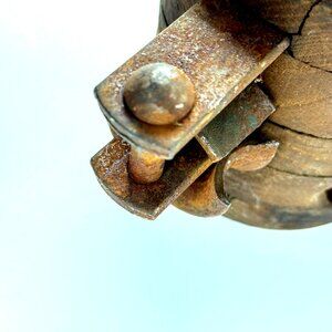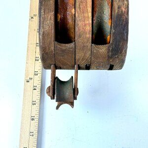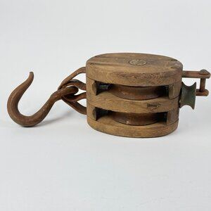 Antique Wooden Double Pulley Block w/ Metal Hook Rustic Farmhouse Barn Decor