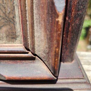 A charming antique wooden swinging picture frame with a timeless design for displaying cherished memories. The aged patina adds character to its antique appeal.