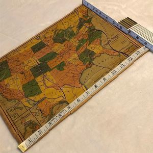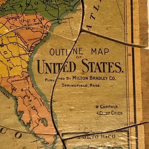 Here we have a wonderful find for the puzzle lover: an antique United States map puzzle by Milton Bradley. This lovely puzzle has wooden pieces covered with paper. It likely dates to the late 19th or early 20th century.