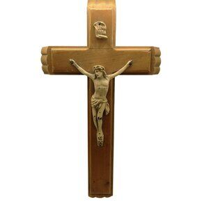 This antique wooden wall crucifix features a detailed metal Christ figure on wooden cross with a hidden compartment containing candles, a holy water bottle, and religious instructions.
