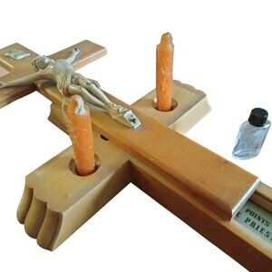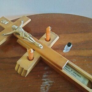 Antique Wooden Wall Crucifix With Hidden Compartment Candles Holy Water Bottle