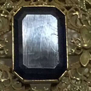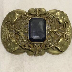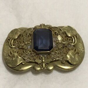 Antique & large Art Nouveau sash brooch w/ Napolean like bee design and blue stone. This is one of the most gorgeous sash brooches that I have ever seen. It measures approximately 3 inches by 2 inches and in wonderful condition. The blue sapphire like stone has a few minor scratches and very tiny flakes on the right side as you can see in the third photo. Other than that, this piece is exquisite. Thank you for looking and please feel free to make an offer on anything.