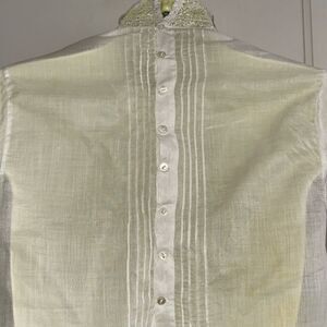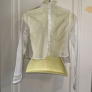 Antique thin white cotton lawn high neck long sleeve blouse with lace & pleats that buttons up back