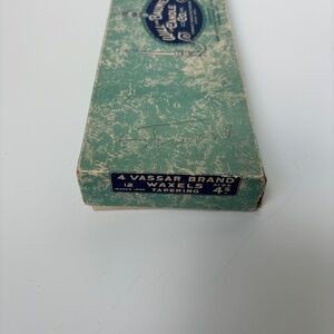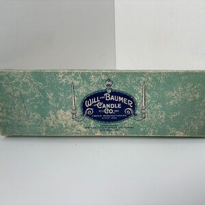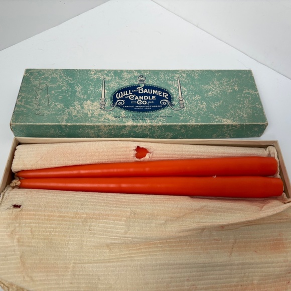 Antique vintage Will & Baumer set of four orange taper candles. Probably from the 50's. Unused. Box says blue, but they are orange. Box itself beautiful and worth displaying.