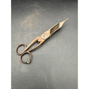 Antique set of hand wrought iron candle wick trimmers / snuffer. This scissors type trimmer is in nice working condition with lots of age from use and a nice old patina. Unsigned, maker unknown. Measures almost 6 1/2 inches long. No damage, nice condition. Refer to the photos for a better idea of the style and condition; you will receive the exact tool that is pictured. Great antique item!!