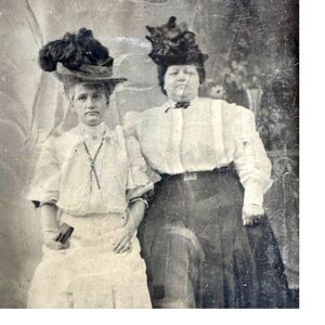 This 19th-century tintype photograph showcases two women in elaborate hats, captured in an ornate cardboard frame. The piece offers a glimpse into historical fashion and photographic techniques, making it a valuable addition to any vintage collection. The image provides a timeless representation of the era's cultural aesthetics.