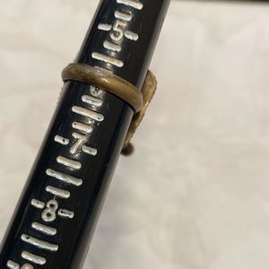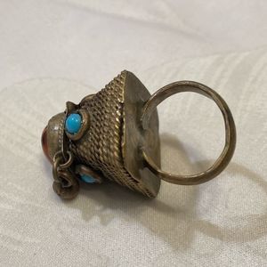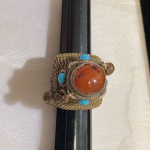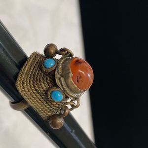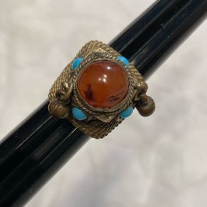 Antique amber and turquoise domed hand wrought brass ring. Two moving brass dangles. The dome measures 1 inch tall and has a 3/4 inch square bottom.