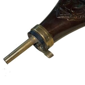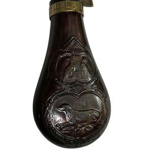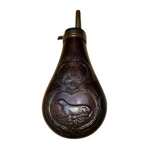 Antique Civil War Dog & Bird Horn Flask Embossed Copper Powder Flask