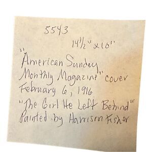 Antique Magazine Cover American Sunday Feb’ 1916. An illustration by Harrison Fisher entitled ‘The Girl He Left Behind’ depicts a lady looking at a picture of a lost love. In excellent antique condition a few small age spots and has a small hole in it (as shown) but paper is still in great condition and would be lovely mounted and framed.