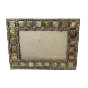 This elegant picture frame combines antique-style gold metal with shimmering mother of pearl inlays and pink gem accents, adding sophisticated charm.