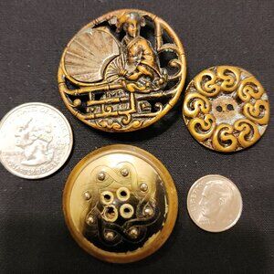 Explore the charm of yesteryear with this lot of 10 metal buttons, each boasting a round shape and a resplendent gold hue. These vintage/antique originals, with their intricate pattern style, are a testament to the craftsmanship of a bygone era. Ideal for collectors, the buttons offer a varied and unique selection for your vintage/antique sewing projects or to add a touch of historical elegance to your wardrobe. Although the country of origin remains a mystery, the quality and detail of these buttons speak to their vintage/antique value. Enhance your collection or infuse a classic aesthetic into your designs with these exquisite metal buttons.