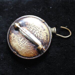 This is an antique/vintage Ketcham & McDougall NY retractable chain brooch with a matte black front. The back is very tarnished and is likely brass. The loop is misshapen and needs to be repaired. The chain works pretty well for its age. Overall, the piece is in pretty good shape.