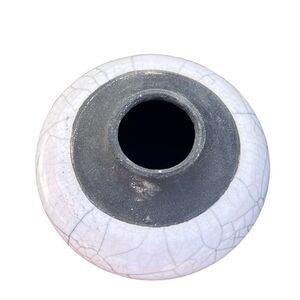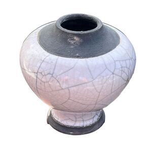 Gorgeous raku studio pottery vase, signed with an initial A on the bottom. Amazing glossy white crackle glaze on an elegant smooth body with a black stepped rim and base. It measures approximately 4” tall and is in very good condition.