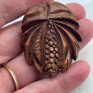 Antique-Vintage hand carved wood fur dress clip. Botanical design . There is color wear on metal. Still clip nice and tight.