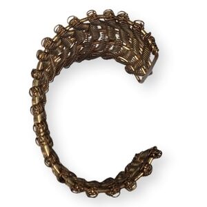 Unique antiqued brass cuff bracelet made of twisted wire spirals woven on a thick wire frame