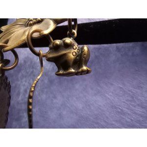 Whimsical gardeners dangle brooch pin in antiqued bronze tone finish. Large sunflower with resting dragonfly has pierced lower petals with dangle charms. Medium size heart with floral border, small frog, leaf, wheelbarrow and additional dragonfly. For hat, smock, vest, scarf or lapel, casual or office. Nice enough for church services, but slap it on your barn coat and make yourself happy. This brooch cannot wait to say 'Welcome, Spring!'