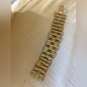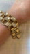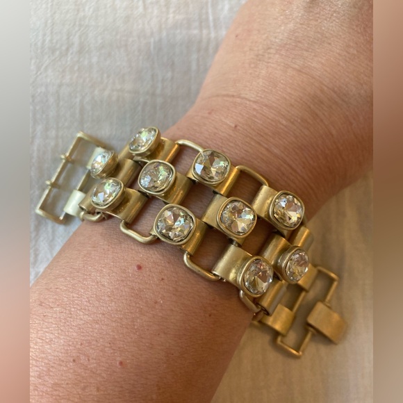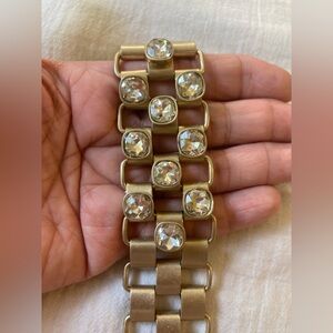 We have a sophisticated bracelet with antiqued/distressed gold tone finish. Book chain design with bezel set clear stones!