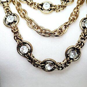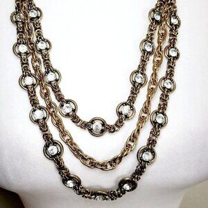 Antiqued Gold Tone Triple Strand Necklace Rhinestones Weighty Nautical Clasp 32"