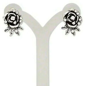Stylish antiqued silver-finished pewter and steel earrings feature roses and leaves with sparkling clear Egyptian crystal rhinestones