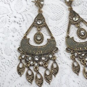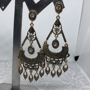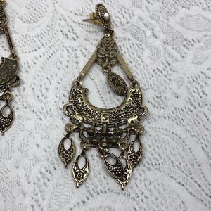 Antiqued brass dangle drop boho long dressy statement earrings makers mark.