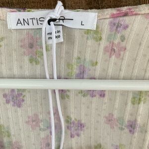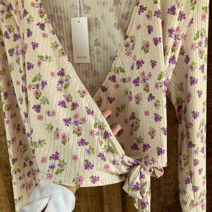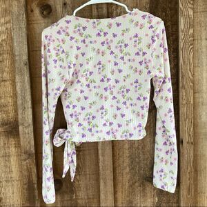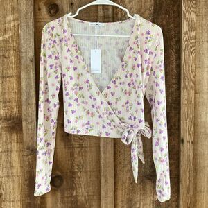 Antistar Floral Plunging V-neck Wrap Ribbed Knit Long Sleeve Cropped Top w Tie