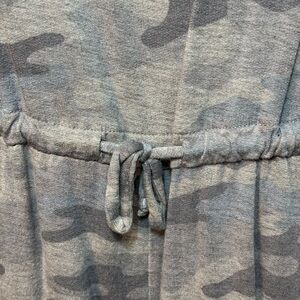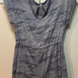 Stylish gray camo romper with a cinched waist, side pockets and keyhole back with button. Perfect for casual outings.