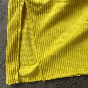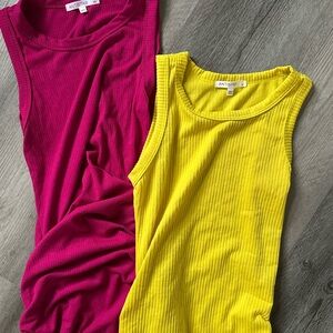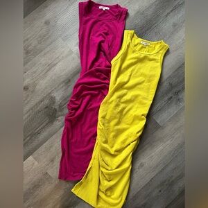 Two gorgeous tank-style midi dresses in bright yellow/green and bold fuchsia. Sleeveless with a scooped neckline and fitted, ruched silhouette. Soft, stretch ribbed fabric. Vibrant, eye-catching colors.