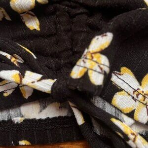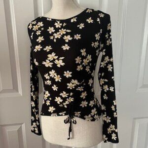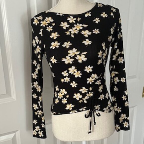 Antistar Ribbed Daisy Print Ruched Top. EUC, seldom worn. Pretty daisy print on black background, long sleeve, ribbed, crew neck top. Left side has draw string to adjust how much ruching you would like (one side only). Slim fit. 87% polyester, 13% spandex for some stretch. Machine wash. Apx. 18" from shoulder to hem.