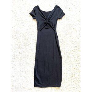 Sleek ribbed midi dress with a back cutout detail, soft stretch fabric, and short sleeves. Ideal for versatile styling with comfort in mind. • Ribbed soft stretch material • Back cutout detail for added style • Short sleeves and midi length • New with tags