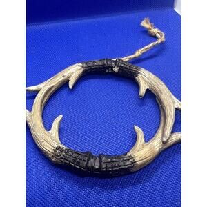 Add a touch of rustic charm to your Christmas decor with this beautiful antler ornament. The circular woven look of this ornament is perfect for hunters cabins or lodge decor. Crafted with care, this decorative piece is sure to impress.