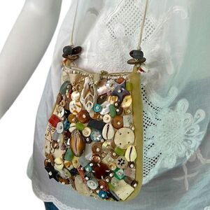 This is an Antoine & Lili small crossbody pouch bag in a light tan suede. Antoine & Lili is a small French clothing company in Paris, along the canal Saint Martin. This bag features a front side that is ornately covered with shells and buttons. The inside is white satin. Fabulous condition. All photos displayed are of the actual item. Measurements;