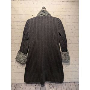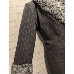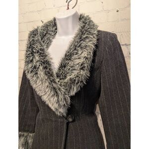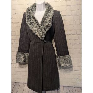 Style:. Beautiful and unique, satin lined , Vintage, faux fur trimmed, pinstriped, single button, fitted, designer, pea coat. This coat is absolutely stunning. The price is firm for now as I would rather keep it as a novelty piece for collection than sell it for a lowball price. The fur on the trim is in excellent condition and doesn't appear knotted up in any way. The wool does not have any visible imperfections either. When worn, it is extremely flattering and fitted and also has pockets on each hip. This very unique vintage piece is in excellent condition. I searched and couldn't find another one like it. There might be, so I'm not saying it's unique entirely but I couldn't find another one to get much information on it.