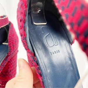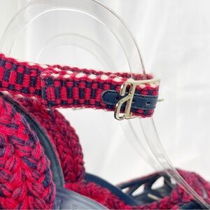 Round open toe, block heel, platform, leather lining and sole, buckle closure, braided weave, red and blue. Casual, spring, summer, travel, vacation, designer, cute. Runs small.