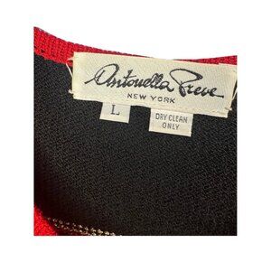 This sophisticated Antonella Preve knit jumpsuit features a striking combination of red and black with elegant gold accents and a bold zebra pattern. Designed in a large size, it offers a refined silhouette with long sleeves and tailored pants, making it a timeless addition to any wardrobe.
