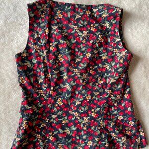 Vintage French Antonelle linen vest with cherry & flower print, navy blue/black background. Buttons down the middle with a high square neckline. Size has faded off of the tag, but it fits me perfectly and I'm 5'9 and tend to be medium/small. Cotton, perfect condition.