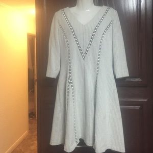 It's a cotton blend, fully lined. Very well made and feels amazing on
