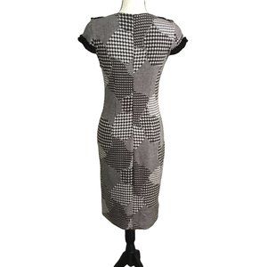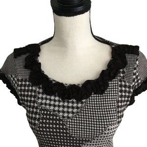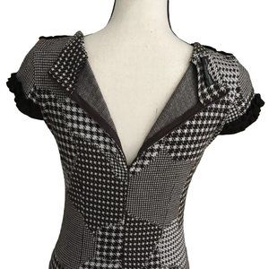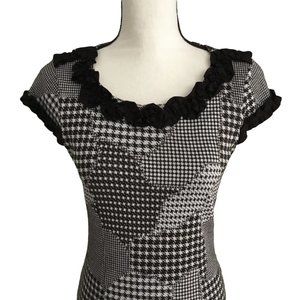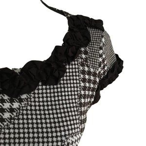 Antonio Derrico black and white houndstooth dress with cap sleeves and round neckline, and zipper in center back. Neck and sleeves have ruffle accent.