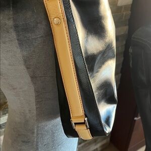 Chic leather tote by Antonio Melani. Features a black body with cream accents. Perfect for any occasion.