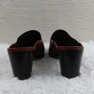 Antonio Melani Women's Dark Brown Leather Glove Fit Square Toe Heeled Mules/Loafer Shoes. 100% Leather Upper/Sole. Normal Leather Upper Creasing. Marks On Sole. Scuff On Right Footbed Heel. Measurement approx. Heel: 2.5