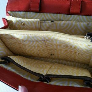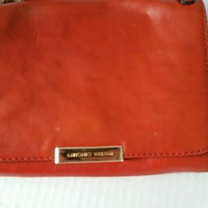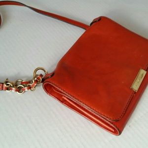 Beautiful and elegant small clutch, comes with removable shoulder strap made of leather and gold colored chain. The inside lining is a bright yellow and white fabric, it does have some black staining inside one of the pockets, but these dies not the away from its beauty and charm. The ouside leather has some darker spots, hence the burnt orange color name, gives it dimension and authenticity. Lots of slots for cards, a zippered pocket and dividers also present. From smoke free and pet free home.