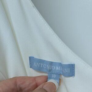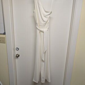 This is a lovely one shoulder jumpsuit from Antonio Melani. Off-White, size 10 the measurements follow. Wide leg. I wore once on the night of my wedding rehearsal dinner. One shoulder, self tie waist, concealed side zipper, lined. It is dry clean only.