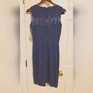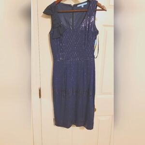 Make a dazzling entrance in this stunning Antonio Melani Chantel cocktail dress. This elegant navy sheath is adorned with shimmering vertical sequins that catch the light from every angle. Featuring a flattering V-neckline, a bold statement bow on the shoulder, and a sleek silhouette, it’s the perfect choice for holiday parties, weddings, or any evening soiree. Fully lined with a back zip closure for a smooth fit. New with tags!