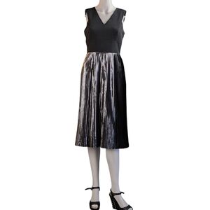 Classy and elegant, this cocktail dress has a fitted yoke, a 3.5" wide waistband, and the skirt falls away in tiny metallic pleats, made from a lightweight, slightly sheer fabric that might be crepe.
